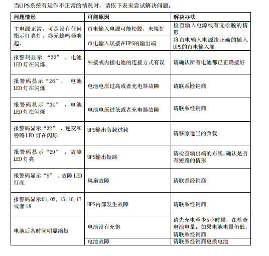 当台达UPS系统有运作不正常的情况时,请依下表来尝试解决问题。 问题情形 可能原因 解决办法 主电源正常,可是没有任何 指示灯亮灯,亦无蜂鸣器响 起。 市电输入电源可能松脱,未接好 检查输入电源线有无松脱的情 形 市电输入误接在UPS的输出端 将市电输入电源线正确的插入 UPS的市电输入端 报警码显示 “33” ,电池 LED 灯在闪烁 外接或内接电池的连接方式有误 请确认所有电池都已正确接好 报警码显示“26”, 电池 LED 灯在闪烁 电池电压过高或者充电器故障 请联系经销商 报警码显示“34” ,电池 LED 灯在闪烁 电池电压过低或者充电器故障 请联系经销商 报警码显示“32” ,逆变和 旁路 LED 灯在闪烁 UPS输出负载过载 请移除适当的负载 报警码显示“29” ,故障 LED 灯亮 UPS输出短路 请检查输出端的布线,确认是否 有短路的情形 报警码显示“9” ,故障 LED 灯亮 风扇故障 请联系经销商 报警码显示01,02, 15,16,17 或者 18 UPS内部发生故障 请联系经销商 电池后备时间明显缩短 电池没有充饱 请先充电至少5小时候,在检查 电池电量。如果电池电量仍低, 请联系经销商 电池故障 请联系经销商更换电池